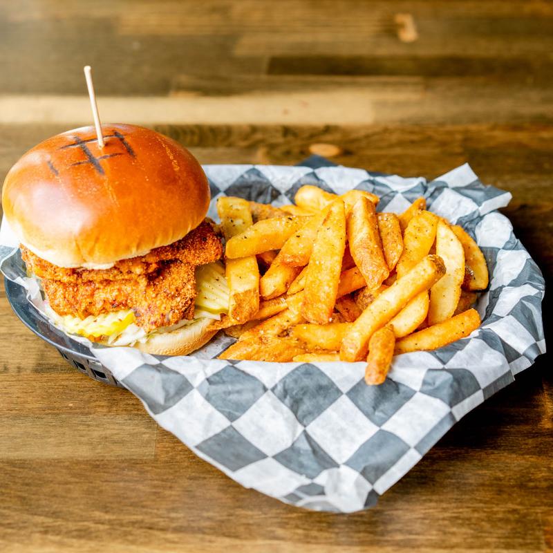 All sandwiches are served with house cooked chips • Upgraded Sides: French Fries +$1 | Sweet Fries +$2 | Truffle Fries +$5 | Coleslaw +$1 | Sautéed Veggies +$3 | Sautéed Spinach +$3 | Coconut Rice +$3 • Burger Adds (+$1): American, Swiss, Cheddar, Provolone, Bleu Cheese, Mushrooms, Jalapeños • Burger Adds (+$2): Smoked Bacon, Fried Egg, Avocado